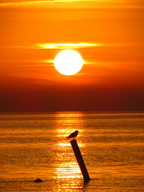 A seagull perched on a pole sticking out of the ocean at sunset.